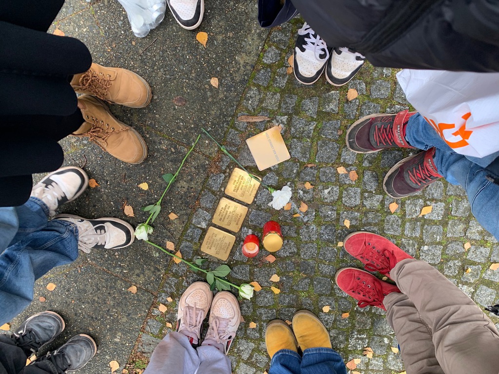 Die Schülerinnen und Schüler haben an die Opfer von Deportation und Vertreibung im Nationalsozialismus gedacht. An allen Steinen haben Kinder aus der Gruppe die zugehörigen Biographien vorgelesen, Blumen niedergelegt und eine Kerze angezündet.