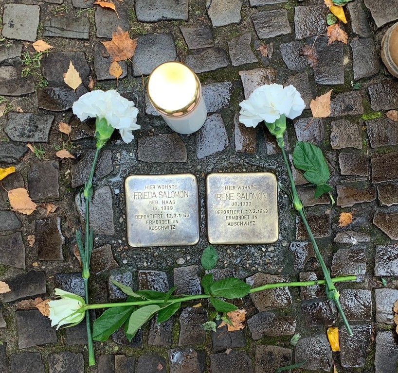 Besondere Aufmerksamkeit galt wieder dem Schicksal und dem Stolperstein von Irene Salomon in der Lorenzstraße 12. Irene ist von April 1937 bis November 1938 in unsere Schule gegangen. Sie wurde in Auschwitz ermordet.